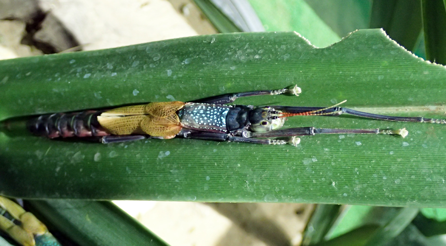 見た目がいかめしいとはいえ、自然界では食べられる側の生き物です。ふだんは葉に体を沿わせてじっとしていることが多く、おそらく野外でも、鳥などの捕食者から身を守るためにこうして隠れているのでしょう。