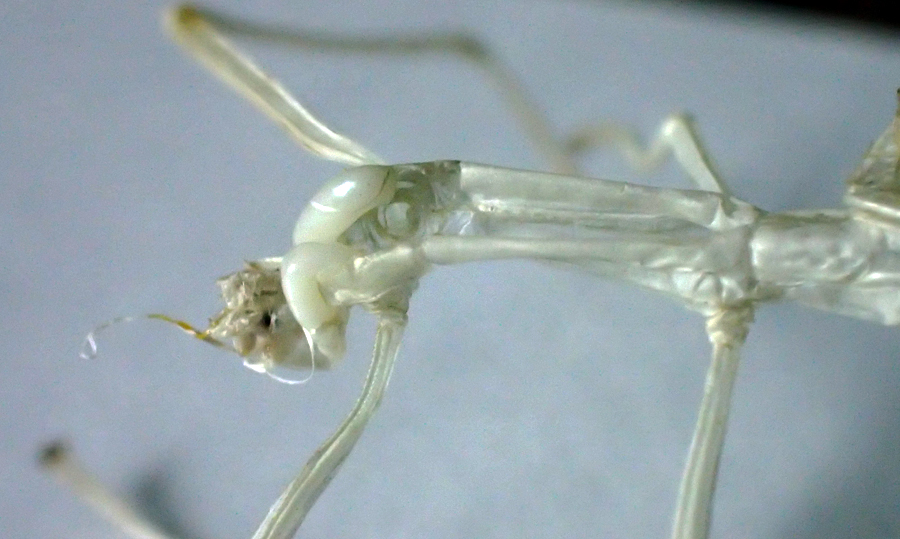 以前こんなことがありました。ツダナナフシも脱皮を繰り返しながら、幼虫から成虫へと成長するので、飼育ケースの中には脱皮殻がときどき落ちているのですが、ある日脱皮殻をよく見てみると、前足の付け根付近に左右に一つずつ、白い液体で満たされた袋がくっついでいました。触ってみるとすぐに割れてしまいましたが、液体の臭いをかいでみると噴射液でした。脱皮とともに、噴射液の入った袋も脱ぎ捨ててしまうようです。ツダナナフシの面白さをまたひとつ発見した瞬間でした。