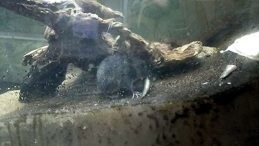 多摩動物公園の「モグラのいえ」に入ると、すぐ右側にカワネズミの展示水槽があります。しかし、昨年(2014年)10月以来、カワネズミの展示は途絶えていました。1年以上にわたって照明を消して準備中だったのですが、けっして展示をあきらめていたわけではありません。昨年11月からこの一年間に採集を9回おこない、ようやく11月26日から展示再開にこぎつけました。