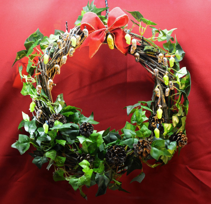 昆虫生態園のツリーは、今年も主役はオオゴマダラの金色の蛹です。多くの方が「これは本物なの!?」とびっくりする、つややかに美しく光り輝く蛹が、ツリーとリースを彩っています。脇役として、ツマムラサキマダラの蛹と、リュウキュウアサギマダラ(またはアサギマダラ)の蛹も飾りました。