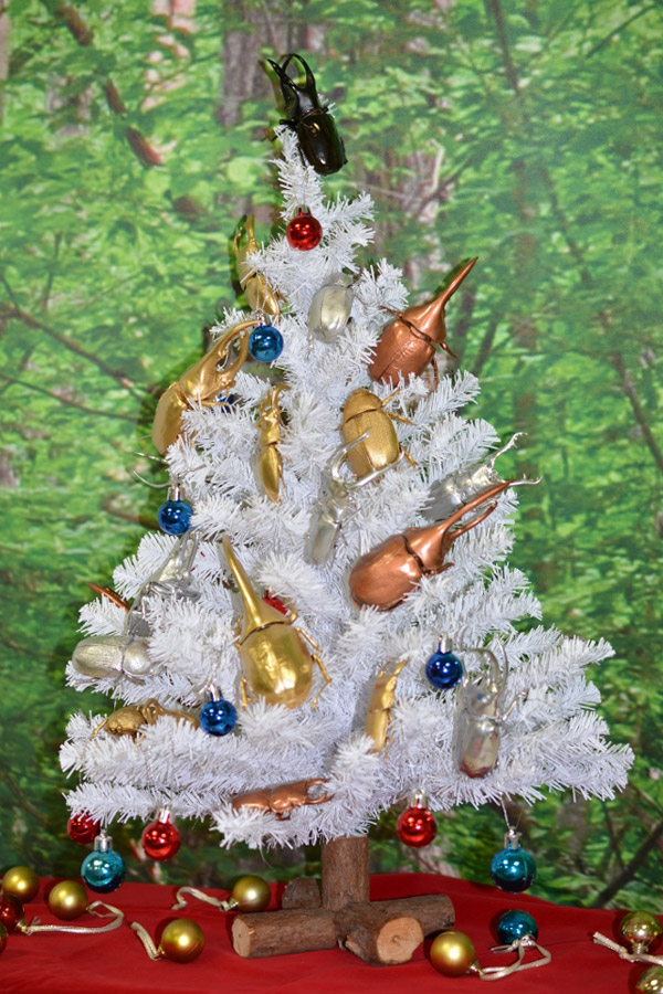 昆虫園本館1階のツリーには、昆虫の標本をメタル調に塗装したものを飾っています。外国産のカブトムシとクワガタムシを塗装してあるので、迫力満点です。細かい産毛も美しく塗装されていますので、じっくりご覧ください。