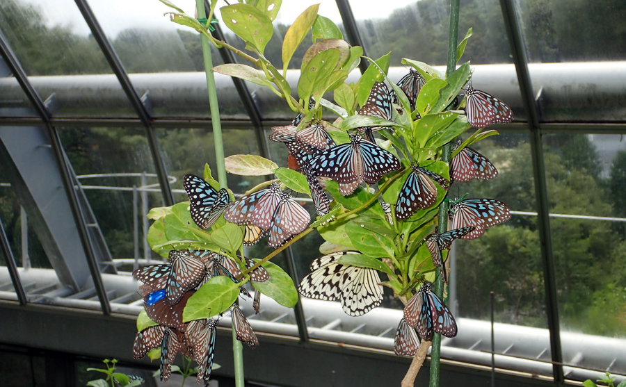 ひらひらと舞うチョウを見るのも素敵ですが、鈴なりのチョウを観察するのもまた別の楽しみ方です(温室内の環境等によって、葉にいないこともあります)。