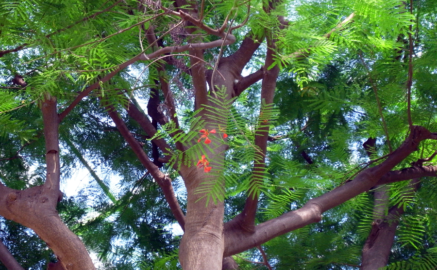 また、昆虫生態園の大温室の中央には巨大なホウオウボクがそびえたっています。例年この時期には赤い花が咲き誇るのですが、今年は前回の剪定の影響か、あまり咲きませんでした。残念ながら花は先日咲き終わりましたが、ぜひ来年にご期待ください。