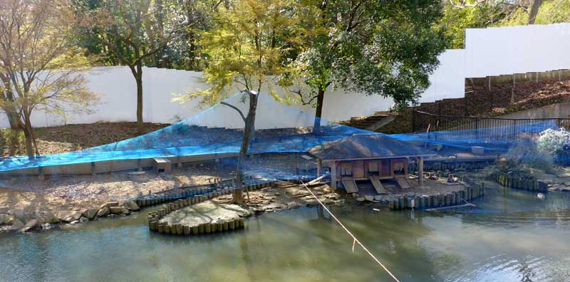 そこで、2015年の春はカラスから卵を守るために、池にネットを張りました。ネットといっても池全体を覆えるような巨大なネットは売っていませんし、張ることも大変です。そこで、ガンたちが好んで卵を産む巣箱の近くや植込みの近くにネットを張ることにしました。