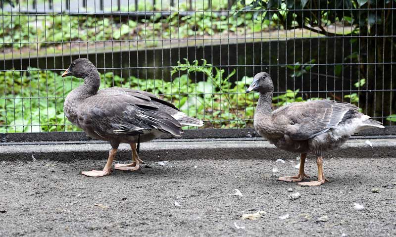 2羽のひなは他のガンのひなと一緒にトキ舎横の5つ連なった飼育ケージですくすくと育っています。まだあどけない幼鳥たちにぜひ会いに来てください。