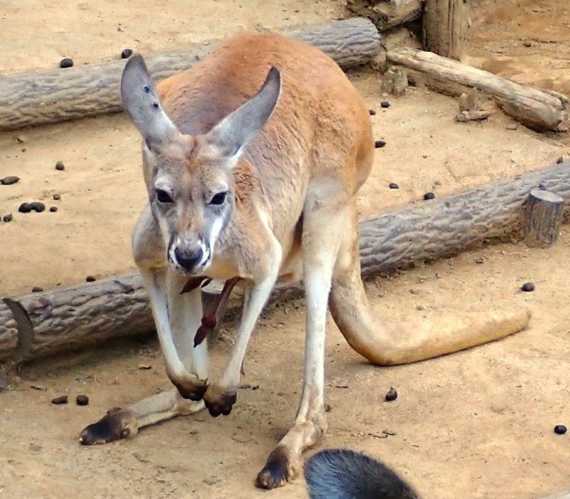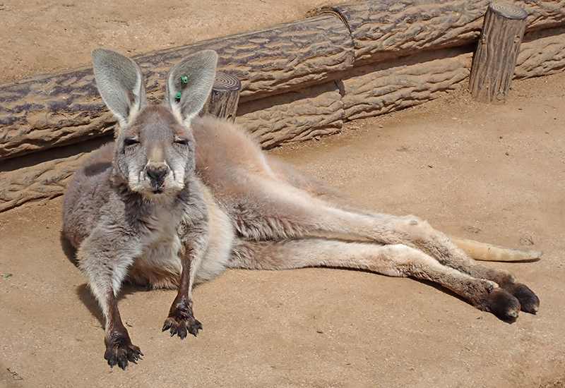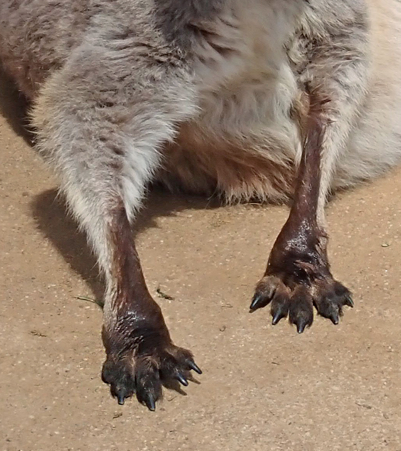 アカカンガルーはあまり汗腺が発達しておらず、ヒトのように汗をかくことができません。汗の代わりに、太い血管が通っている前肢や後肢を舐めることで、体表を濡らしています。これはヒトの汗と同じで、水分が蒸発するときに周囲の熱を奪う「気化熱」という現象を利用し、体温を下げています。