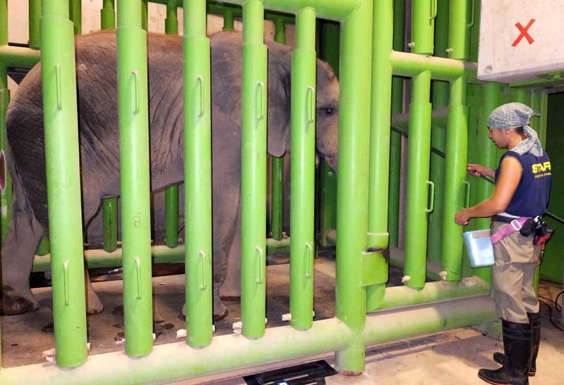 また、体重計のある場所まで砥夢を移動させないといけません。ゾウ舎内には砥夢がまだ行ったことのない部屋や通路があったので、そういった場所に慣れさせる必要がありました。いろいろな事前想定や心配をしていたのですが、砥夢の性格なのか、オスとして自信なのか、驚くくらいに早く順調に新しい場所に慣れていきました。