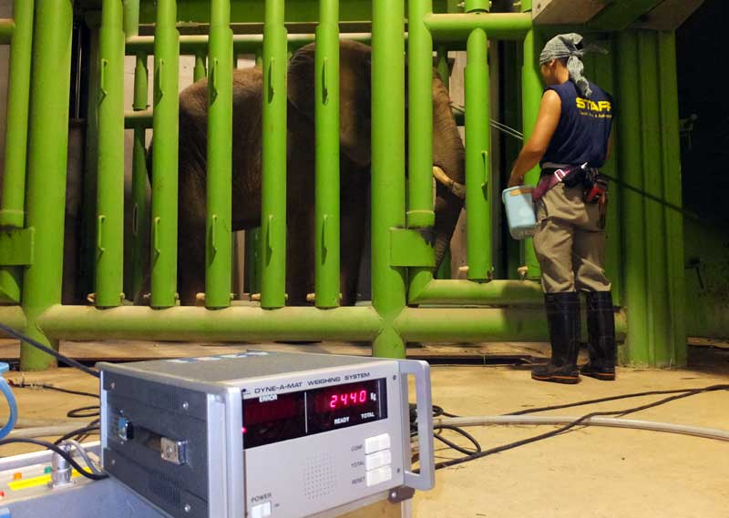 こうして多摩での生活にも慣れ、来園したときに比べて体もとても大きくなりました。さて、そこで気になるのがどれくらい大きくなったのか、ということです。来園時の体重は約1400キロでしたが、約2年半経った今、何キロになっているのか? 体重測定をおこなうことにしました。
