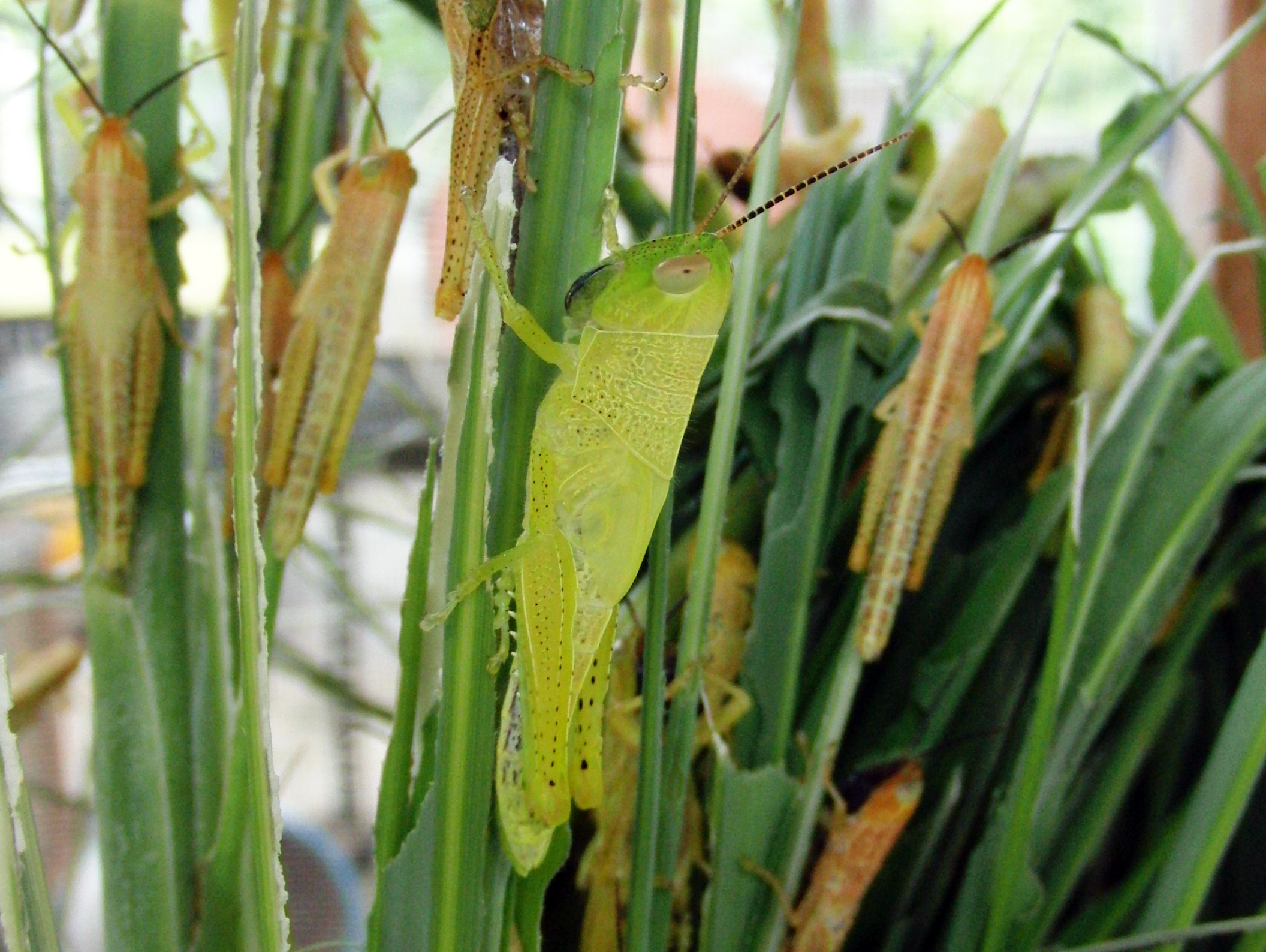 動物園で飼育している他の種類のバッタはイネ科以外の植物だけでなく、果物など、意外にさまざまな種類のものを食べます。変わったところでは、ニンジンやマウス用ペレットを与えると、たいていどの種類のバッタも群がって食べます。ところがヒゲマダライナゴは見向きもしません。食べるえさの種類が非常にかぎられているのです。