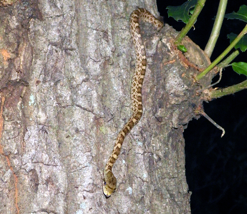 また、採集は危険と背中合わせです。木にぶら下がっているヘビがいたので手を伸ばそうとした瞬間、隣にいたもう一人の職員から「若いマムシじゃない?」と言われ、すぐ離れたのですが、後日、撮影した写真を他の職員にみせたところ「アオダイショウだよ」とのことでした。アオダイショウの若い個体の体には、成体とはちがってマムシに似た模様があるため、間違えられることが多いようです。とんだ勘違いでした。