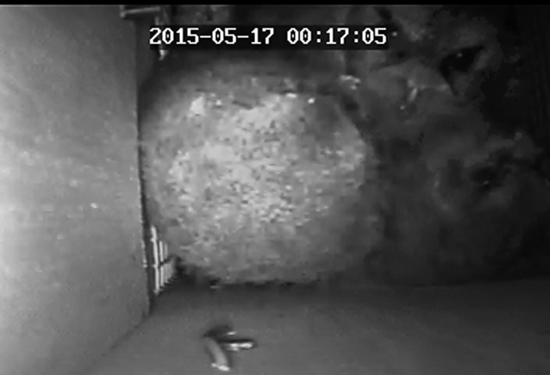 そして春になると、ひそかに期待していた姿を見ることができました。それは、巣箱の中で子育てをする姿です。3月なかば、発情期特有の鳴き交わしが聞こえるようになりました。オスは携帯電話のバイブ音のようなブーブーブーという低い声を出し、メスはそこに合いの手をいれるようにフィーフィーと鳴いて答えます。それからしばらくした日の夕方、いつもは静かなケージ内でオオコノハズクたちが活発に動いていました。メスにのって交尾をするオス、それを追い払う別のオス、メスのいる巣箱にえさのマウスを届けるオスなど、まさに繁殖期真っ盛りという感じでした。