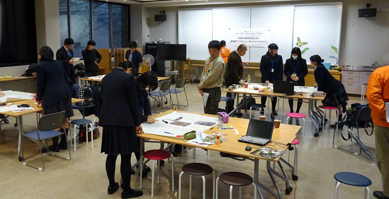 その後、4つのグループに分かれ、4人の講師が各グループを順番に回って座談会をおこないました。座談会の講師は清水教授のほかに、東京都小笠原レンジャーの後藤雅文氏と、都立動物園が飼育繁殖に取り組むアカガシラカラスバトおよびオガサワラシジミの各担当者です。小笠原の自然について各分野の講師の話を聞いたり、参加した生徒が小笠原で見た印象的な生き物について話をしたり、自由な雰囲気で意見交換ができる場となりました。