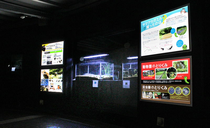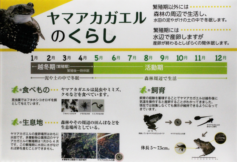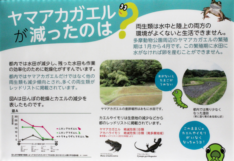 パネルでは、ヤマアカガエルが減少している理由、食べもの、くらしなどについて解説するとともに、昆虫園での保全活動や、公益財団法人東京動物園協会が上野動物園、多摩動物公園、葛西臨海水族園、井の頭自然文化園で取り組んでいるアカハライモリの保全活動などが紹介されています。