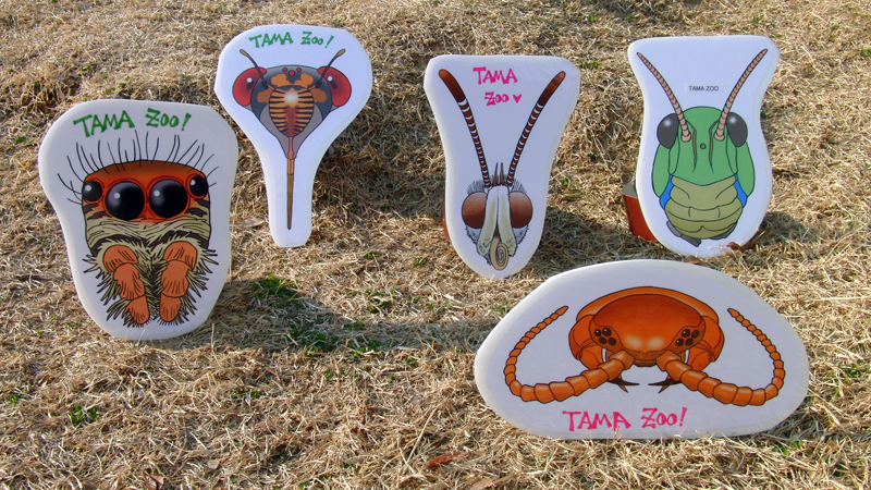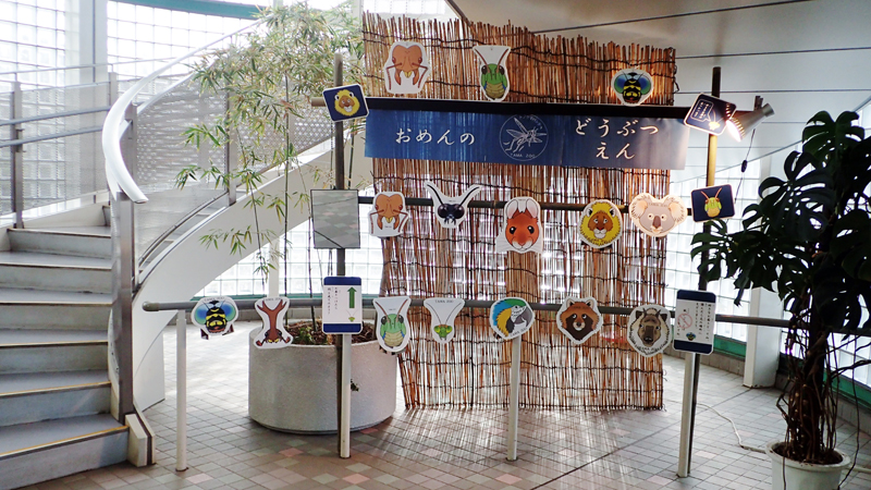 多摩動物公園の昆虫園本館1階のエントランスホールに「おめんのどうぶつえん」がオープンしました。来園したみなさんが自由に手に取れるよう、12種の動物(そのうち昆虫は6種)のお面を並べた、屋台型の展示です。