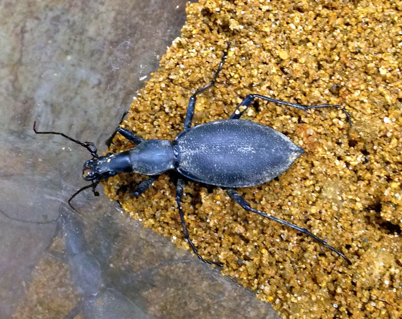 みなさんはマイマイカブリという昆虫をご存知ですか? 名前は聞いたことはあっても、その姿を見たことがある人は意外に少ないかもしれません。細く伸ばしたひょうたんのような形をしており、体長は30〜50ミリ、色は青紺色〜黒色、細長い首が特徴的なオサムシのなかまです。マイマイ(かたつむり)を食べることでよく知られています。