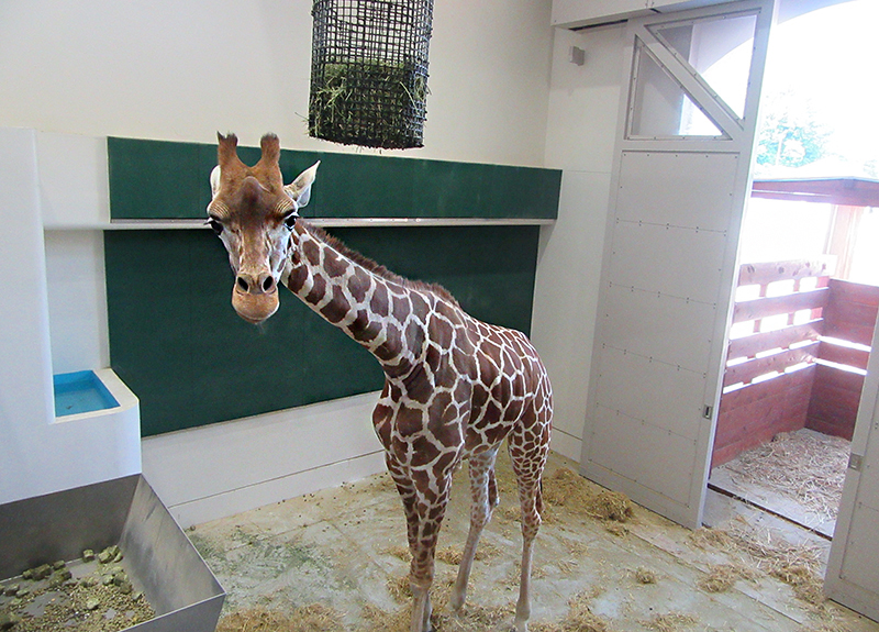 飼育担当者の心配をよそに、単独での馴致はとても順調でした。新しいキリン舎の隔離パドックや隔離室は、構造上キリンの搬出作業に適していたようです。今回ユウヒは1頭だけの馴致でしたが、警戒心が解けるのに時間がかかりませんでした。
