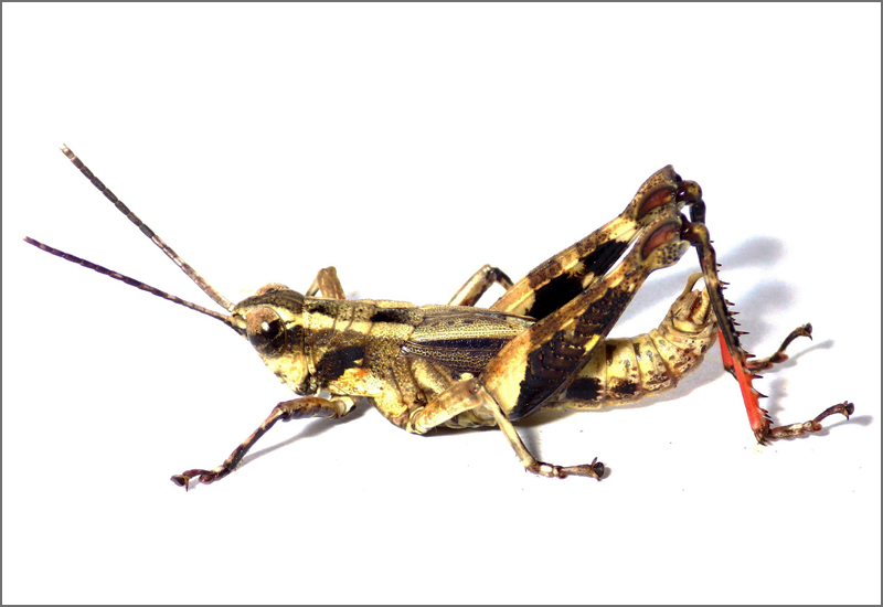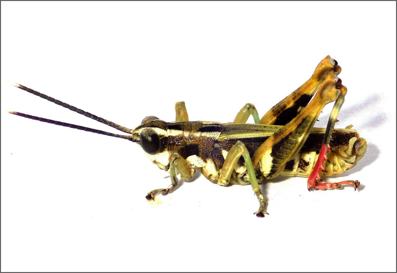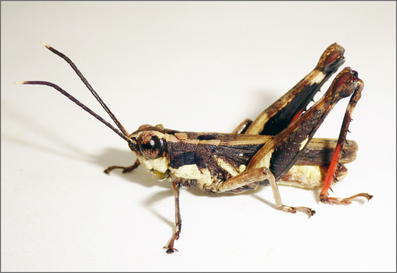 モリバッタの各亜種は、後ろ脚の先端の色や翅の長さなどによって区別することができます。なかなか見わけるのが難しいのですが、イリオモテモリバッタの中には後ろ脚の先端が赤いタイプと青いタイプが存在します(それぞれスネアカ型、スネアオ型と呼ばれます)。