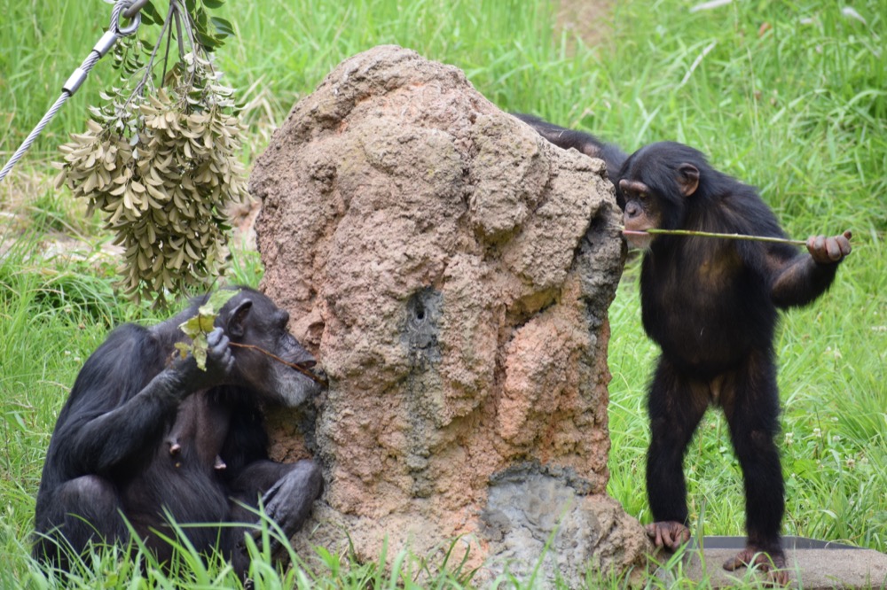 これは人工アリ塚です。野生ではチンパンジーがアリ塚に枝を差し込み、そこにかみついたアリを引き出して食べる行動が観察されています。この行動にヒントを得て、チンパンジーの「道具を作り使う行動」を引き出すために人工アリ塚が作られました。中には薄めたジュースが入っており、チンパンジーは効率よくジュースを飲むために、枝の先を噛み潰して筆状にした枝に浸み込ませて飲みます。