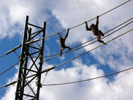 「スカイウォーク」は、樹上で生活するオランウータンの特徴的な生態を活かして、高い場所に渡したロープを渡るための施設、そして、その行動のこと。