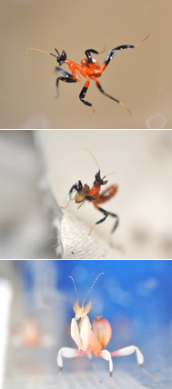 写真上:ツートンカラーが美しいハナカマキリの1令幼虫