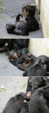 しかし、こんなにも控えめ(?)なメンバーたちを差し置いて、大胆な行動を見せる個体もいます。それは、フブキの姉の「ミカン」です。ミカンはモモコの腕の中から「よいしょ」とフブキを引っ張り出して、まるで母のように抱きしめ、モモコの代わりに子守りをするのです。もちろんチンパンジーの世界では上の子が下の子の面倒を見ることは珍しくありませんが、「あの勝ち気でわがままなミカンが、お姉ちゃんらしいことをしてる!」と感動せずにはいられませんでした。ミカンはモモコの出産に立ち会い、出産当日から現在までモモコやフブキと同じ寝室で過ごしています。寝室ではかなりフブキの世話を任されているので、モモコにとってミカンは群れのメンバーの誰よりも特別な存在なのでしょう。
