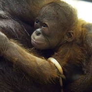 写真:オランウータンの子「アピ」、腕にへその緒が絡まっている