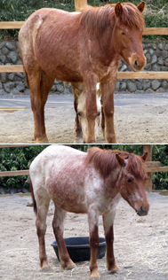 仁太郎は栗粕毛(くりかすげ)という毛色で、冬は濃い茶色の長毛ですが、夏になると白い毛が首、胴体、四肢の上部を中心に茶色と混じるように生え揃います。面白いのは徐々に白い毛が生えて茶色と混じるのではなく、一度胴体が白い毛で覆われたかと思うと、またその毛が抜け落ち茶色との混合色になりました。