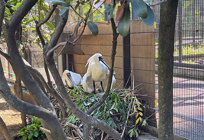 巣材として、ケージ内の樹木を剪定してその枝をいれることもありますが、多くはクロツラヘラサギ自身が、植えられている樹木の枝を折って持ってきています。へらのようなくちばしは、なんとも効率が悪い形に見えますが、彼らは器用に枝をくちばしで挟んで折っていました。ときには、隣の巣から横取りしていることもありました。巣材が多く運ばれ、巣の高さがだんだん高くなっていく巣が出てきました。ペアの力関係が表れているのかもしれません。