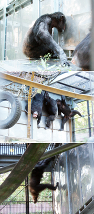 非公開の二つの放飼場は壁を挟んで隣接しています。壁には隙間もあり、オス同士が干渉し合う格好の場所になります。チンパンジーは直接攻撃するだけでなく、「ディスプレイ」という行動によって自分の力を誇示します。壁を叩いたり、丸太を転がしたり、ポリタンクを放り投げたりと、さまざまな方法で周りの個体に自分の強さをアピールします。