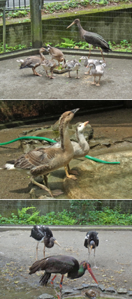 そこで、このエリアで一番広いナベコウ展示場に、この7羽を合流させてみることにしました。別種であればさほど気にしないとは聞いていましたが、万が一、ナベコウに攻撃されたらすぐに分けられるよう、合流後しばらくようすを見ていましたが、驚くほどお互いを気にしません。