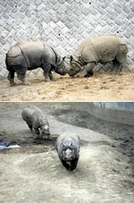 インドサイは基本的には単独性のため、1頭ずつで飼育しています。メスは50〜60日間隔で発情が来るので、そのときにオスとメスを同居させればよいのですが、インドサイのペアリングは、オスとメスが激しくぶつかり合い、とくにメスがオスに追われて怪我をしてしまうことがあるようで、動物園でのペアリングは注意が必要といわれています。