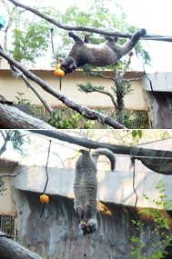 毎月1〜2回おこなっているハクビシンの「キーパーズトーク」では、綱渡りを実施しています。運動場の木と木の間に太さ1センチほどのロープを張り、長さ50センチくらいの結束バンドを1本ずつ5か所にぶら下げてあります。そしてその結束バンドの先にハクビシンの大好きなミカン、リンゴ、バナナなどの果物を刺します。ハクビシンはしっかりロープを掴んで渡り、果物があるところまで行くと、後ろ足でぶら下がり、前足を使って果物を掴んで食べます。