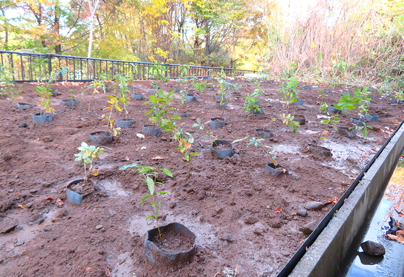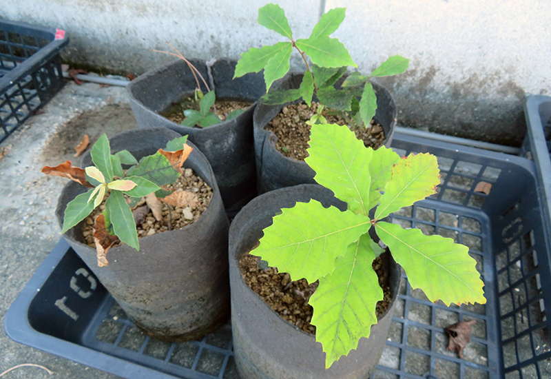 また、ボランティアの方と協同で、多摩動物公園産の苗木も育てています。昨年7月、バックヤードにあるコアラ用のユーカリ温室の横に、苗木を育てるための圃場(ほじょう)が新しく完成しました。園内で拾い集めたドングリを育てたり、園内のほかの場所から移植した実生を育てています。これらの多摩動物公園産の苗木を大きく育てて、今後園内に植樹する予定です。
