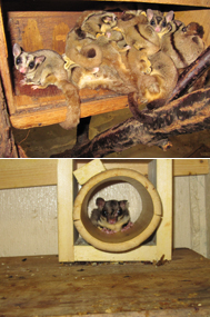 2012年初め、展示室内の床の隅にうずくまるフクロモモンガを発見しました。直ちに捕獲して保護しなければと手を出すと、むくっと起き上がり「ガァガァ」奇声上げながら、走って逃げていきました。ケガでも病気でもなさそうなので一安心。
