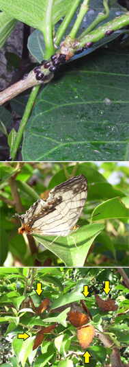 写真下:ベンジャミンに集まるカバタテハ(矢印)