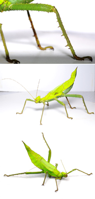 この威嚇状態のときに不用意に近づくと、そのトゲだらけの脚に挟まれ(しかも放してくれず)、かなり痛い思いをします。担当している外国産昆虫の痛さランキングでは、確実に上位に食い込める痛さです。掃除をしたり、餌の葉を替えたりするたびに必ず威嚇されるので、大きさのわりに臆病なのかも知れません。