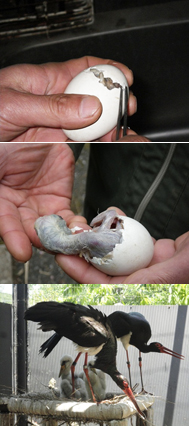 4月に検卵すると、すべてが有精卵と判明しました。5羽を一度に育てるのはさすがに大変です。そこで、2卵はモウコノウマ展示場上のコウノトリ舎にいるナベコウのペアに預けることにしました。