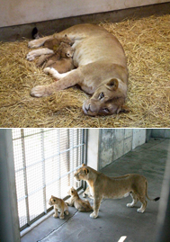 今後お見合いを進めながら、休園日を利用して大放飼場に少しずつ慣らしていきます。順調にいけば2011年5月中には元気に遊びまわる3頭の子ライオンの姿を見ていただけると思います。