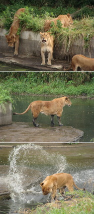 しかしそんな中、一部の個体がライオン園の中にある池に入って、元気に水遊びをしています。それはケイコ(8歳)、ナナ(3歳)、ミキ(3歳)、ラン(11歳)の若いメスたちです。オスや年長のメスは池の中には入らず、周りで水遊びをする程度ですが、ケイコたちは、1頭が池に入ると次から次へと後に続きます。