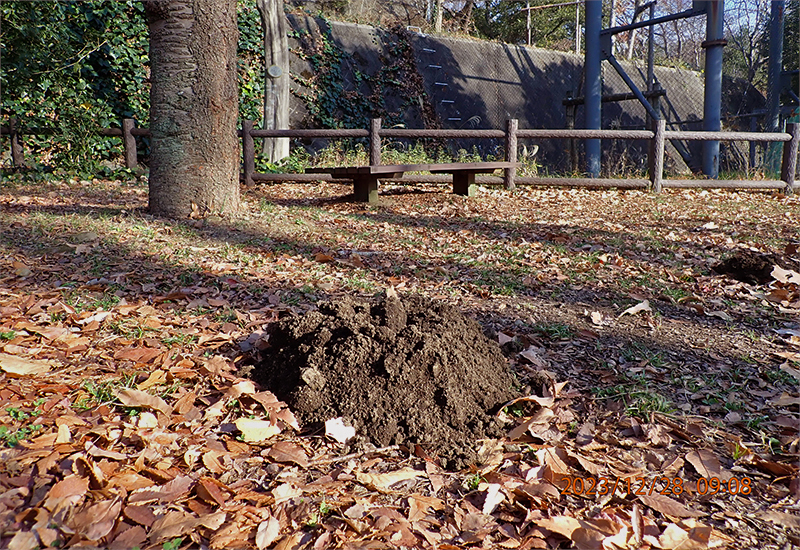 公園や畑の土が盛り上がったり、ぼこぼこしたところは、巣ではないのですが、おそらくモグラのしわざです。これは「モグラ塚」というもので、モグラの痕跡ではいちばん身近なものです。多摩動物公園でも園内にモグラ塚はたびたび出現します。モグラ塚は、モグラが地中に通路や休憩場所などを掘り、残土を地上へ押すことでこのような現象が起きます。なので、周辺の地中にはモグラがいるのはおおむね間違いないでしょう。