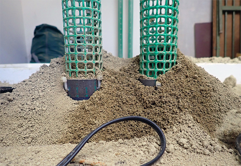 じつは飼育をしていても、モグラ塚ができることがあります。公開展示していないモグラの飼育ケースですが、構造上、余分な土を外に出すことがあり、それがモグラ塚のようになります。今回、これをモグラのいえに再現できないか試してみることにしました。