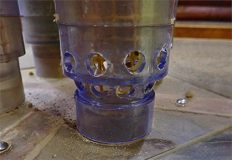 次は、アズマモグラ展示場の飼育ケースから直接伸びるアクリルパイプの通路の一部に穴をあけ、テーブルから余分な土を出させるように仕向けました。