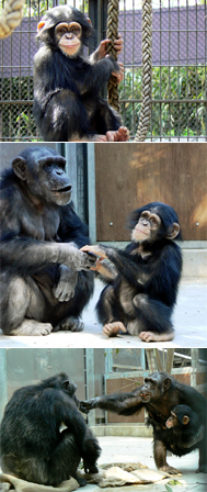 生まれてからずっと続けてきた群れのチンパンジーたちとのお見合いから、ジンはサザエ(推定28歳)との相性がよく、サザエに養母となってもらうことになりました。サザエと娘のミル(7歳)との同居が12月から始まり、一時、高熱やひどい咳などの重い風邪の症状のため分離したこともありましたが、5か月が経過し、同居も成功しています。
