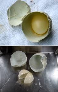 さて、腐っていると判断されたクロトキの大きな卵。大きさが普通のものとちがうので、割ってみることにしました。腐敗している卵を割ると破裂し、臭いもくさいので、なるべく近づかず、卵を地面の上に置き、木の枝先でおそるおそるたたきました。カチッと卵に枝があたり割れたのですが、予想に反し、臭いも破裂もしません。