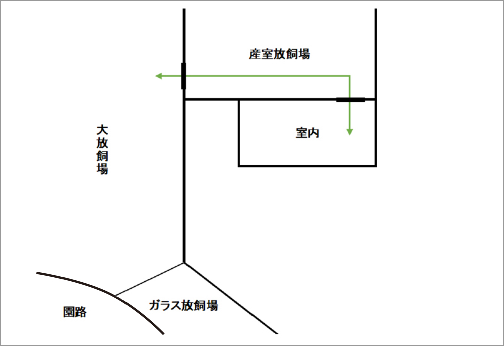 展示場は大放飼場とガラス放飼場があります。カロリーナは、室内から非公開スペースの産室放飼場を通過することで「出舎」つまり、大放飼場に出ていくことができます。