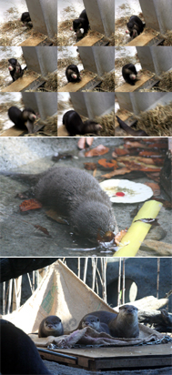 コツメカワウソはオスも育児に参加するといわれています。ところが10月26日、メスが赤ちゃんの首筋をくわえて持ち上げ、巣から巣へと引越しを始めると、ゴンタくんは引っ越し先とは別の巣に他の赤ちゃんを連れて行ってしまいます。いったい、手伝っているのか、ジャマをしているのか、わかりません。そんな行動にカワちゃんもあきれたのか、ゴンタくんが運んでいる子を奪い返すこともありました。