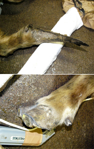 目が見えず、行動が制限されてしまうためか、前脚の爪(蹄)が伸びてしまうので、毎年麻酔をかけて爪切りをおこなっています。しかし、昨年は妊娠の可能性があったので麻酔がかけられず、爪切りができませんでした。そのため爪がかなり伸びてしまい、左前脚は130ミリ、右前脚は250ミリもの長さ(写真上)になっていて、かなり歩きづらそうにしていました。