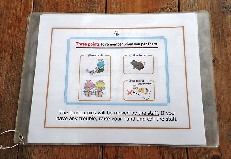 プログラム開始前に必要な方にお渡しし、紙芝居の進行に合わせて参加者自身にページをめくってもらうため、サイズは持ちやすいB5サイズ。口頭で伝える内容をそのまま英訳すると膨大な字数になり、読みづらくなってしまうため、伝えたい内容を簡潔にまとめて1ページに2行程度にしました。口頭で説明する重要な部分、たとえば、モルモットを触るときに気をつけてほしいことなども盛り込み、英語がわからない職員が担当であっても、シートさえあれば対応に困らないように作成しています。