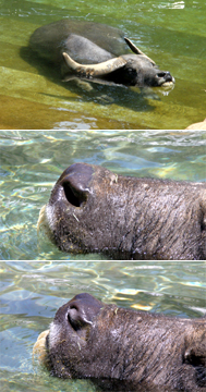 そして、スイギュウを見るときに注目していただきたいポイントがあります。それは「鼻」です。みなさんはプールで鼻に水が入って痛い思いをした、という経験はありませんか? 水の好きなスイギュウは、そんなことのないように、鼻が「開閉式」になっています。