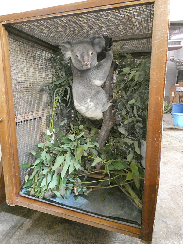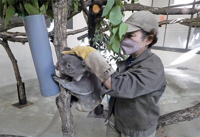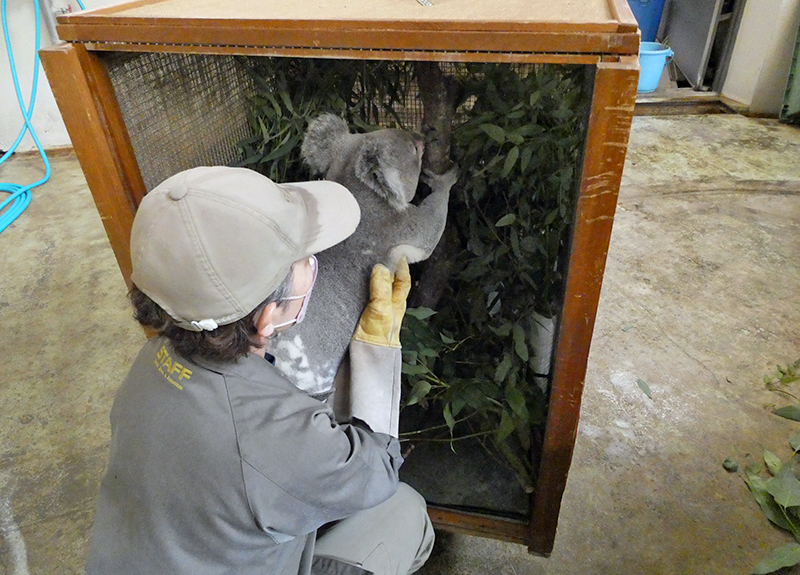 多摩の輸送箱は過去にオーストラリアからコアラを輸入したときに使われたもので、コアラの大きさに対し大きめの箱になっています。輸送箱の中にはつかまり座れるような止まり木を設置し、ユーカリの枝を中にたくさん入れて使います。